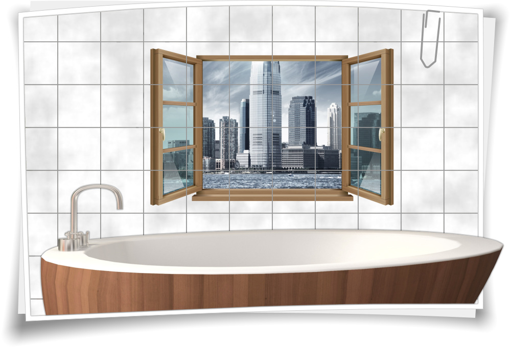 Fliesen-Aufkleber Fliesen-Bild Fenster Skyline City Wolkenkratzer Stadt Zentrum Wasser Bad WC Aufkleber Folie Deko
