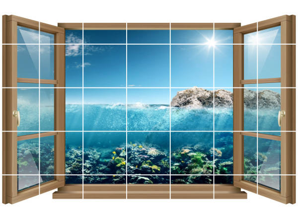 Fliesen-Aufkleber Fliesen-Bild Fenster Unterwasser-Welt Korallen-Riff Felsen Fische Bad WC Aufkleber Folie Deko