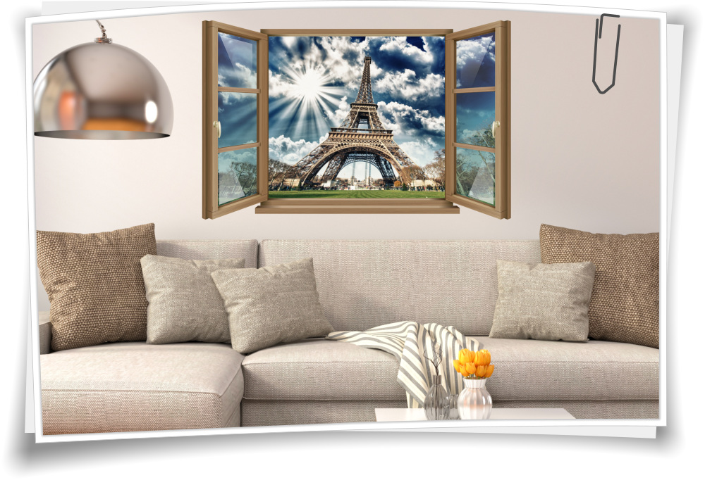 Wand-Tattoo Wand-Bild Fenster Eiffelturm Paris Frankreich Europa Sonne Wolken Aufkleber Folie Deko