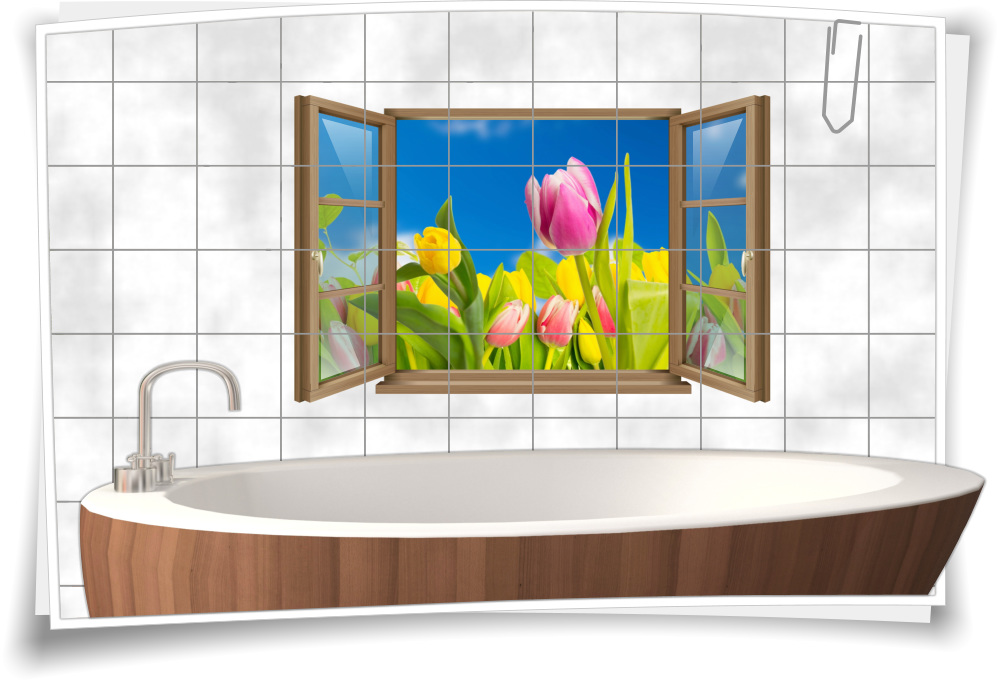 Fliesen-Aufkleber Fliesen-Bild Fenster Tulpen Blumen-Strauß Bunt Blau Rosen Garten Bad WC Aufkleber Folie Deko