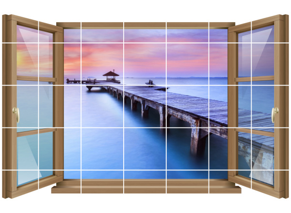 Fliesen-Aufkleber Fliesen-Bild Fenster Holz-Steg Wasser Hütte Natur Sonne Bad WC Aufkleber Folie Deko