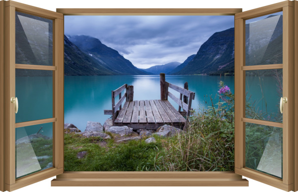 Wand-Tattoo Wand-Bild Fenster Landschaft Steg Natur Berge See Aufkleber Folie Deko
