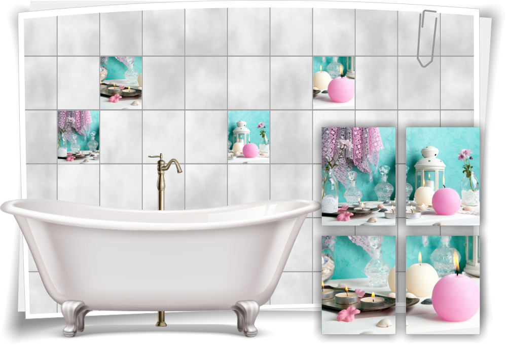 Fliesen-Aufkleber SPA Wellness Kerze Vasen Muschel Lila Weiß Türkis Bad WC Deko