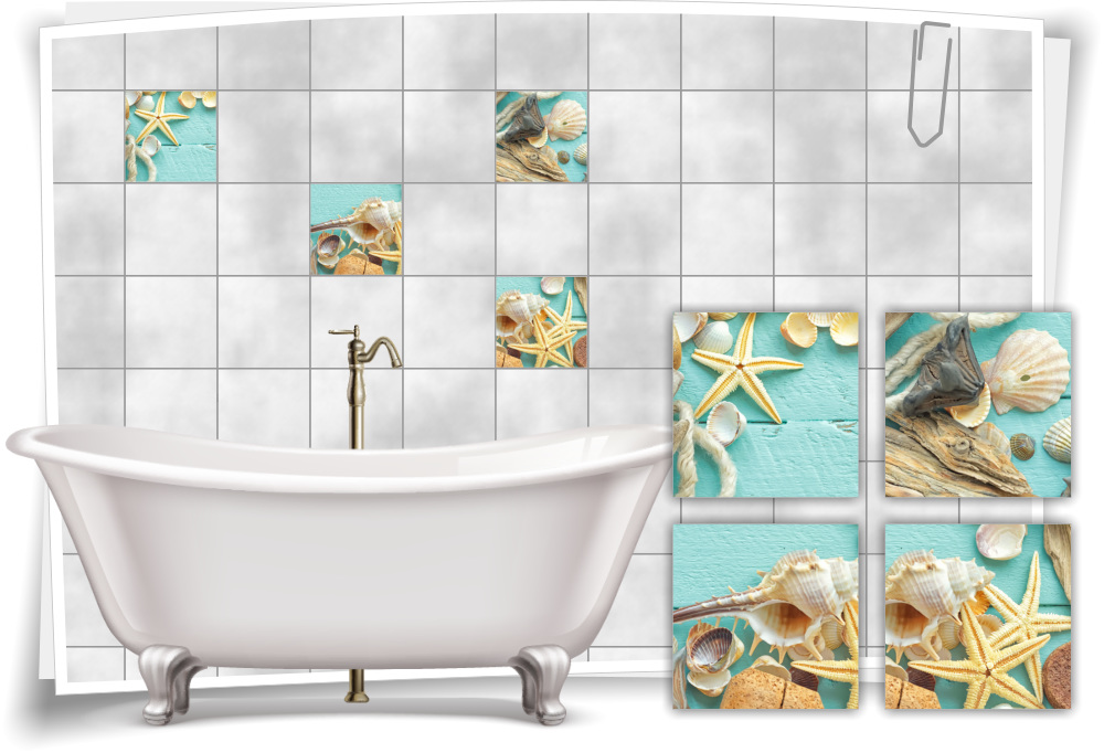 Fliesen-Aufkleber SPA Wellness Seestern Muschel Holz Türkis Bad WC Deko