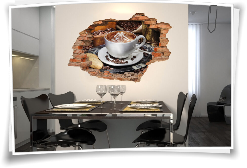 Wandbild Wanddurchbruch Kaffee Kaffeebohnen Kaffeetasse Gebäck