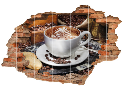 Fliesenaufkleber Wanddurchbruch Kaffee Kaffeebohnen Kaffeetasse Gebäck