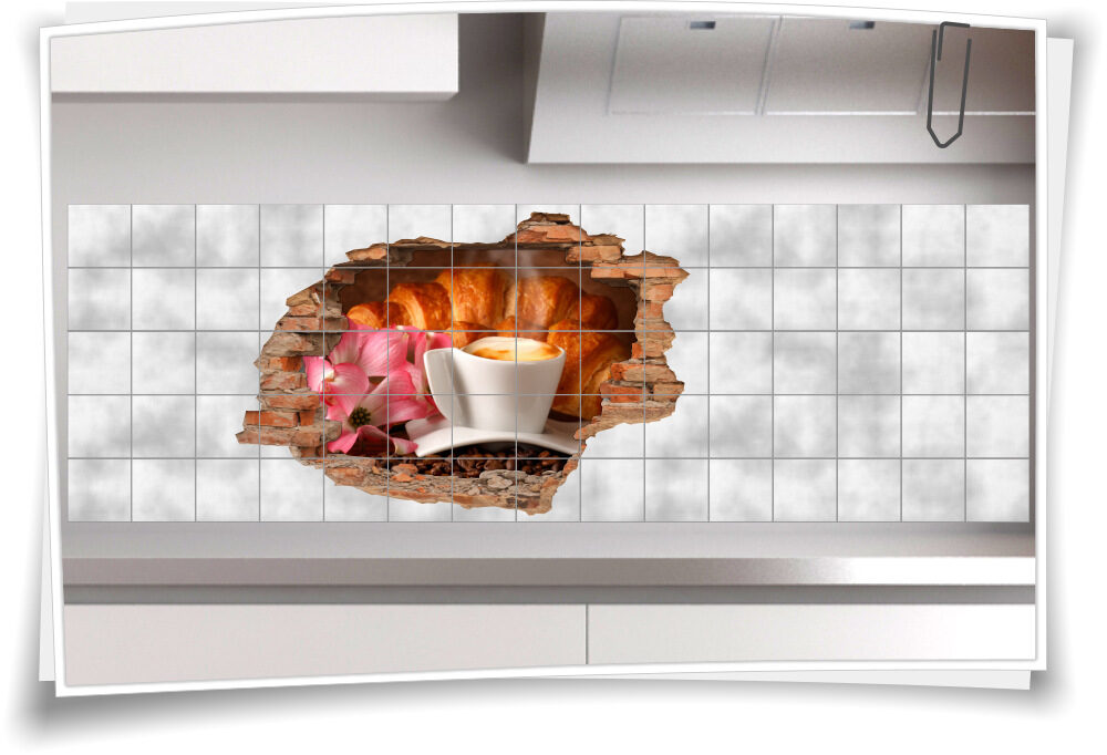 Fliesenaufkleber Wanddurchbruch Küche Frühstück Kaffee Croissant Blüten