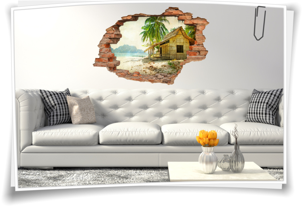 Wandbild Aufkleber Wanddurchbruch Strand Palmen Hütte Abstrakt Nostalgie