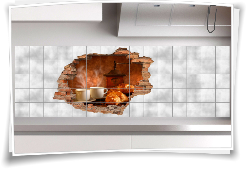 Fliesenaufkleber Aufkleber Wanddurchbruch Kaffee Kaffeemühle Croissant Frühstück