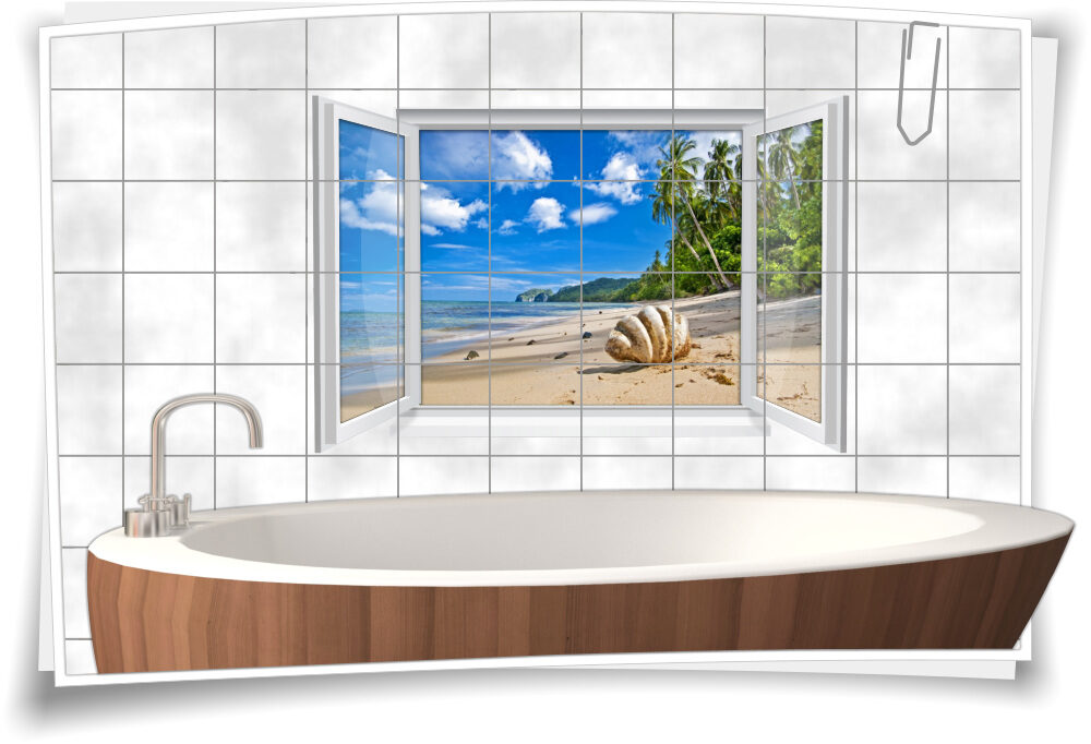 Fliesenaufkleber Fliesenbild Fenster Sand Strand Muschel Meer Bad WC Fliesen