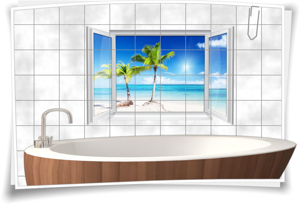 Fliesenaufkleber Fliesenbild Fenster Meer Strand Palmen Urlaub Bad WC Fliesen Deko