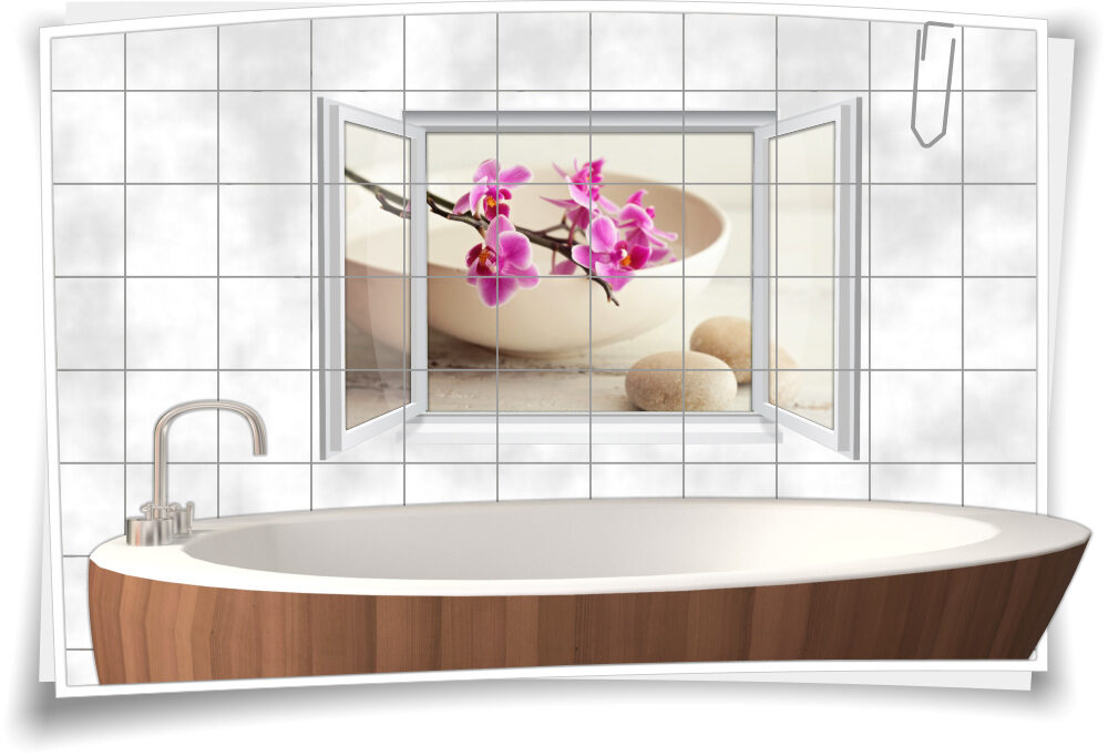 Fliesenaufkleber Fliesenbild Fenster Wellness SPA Orchidee Steine Bad WC Fliesen Deko