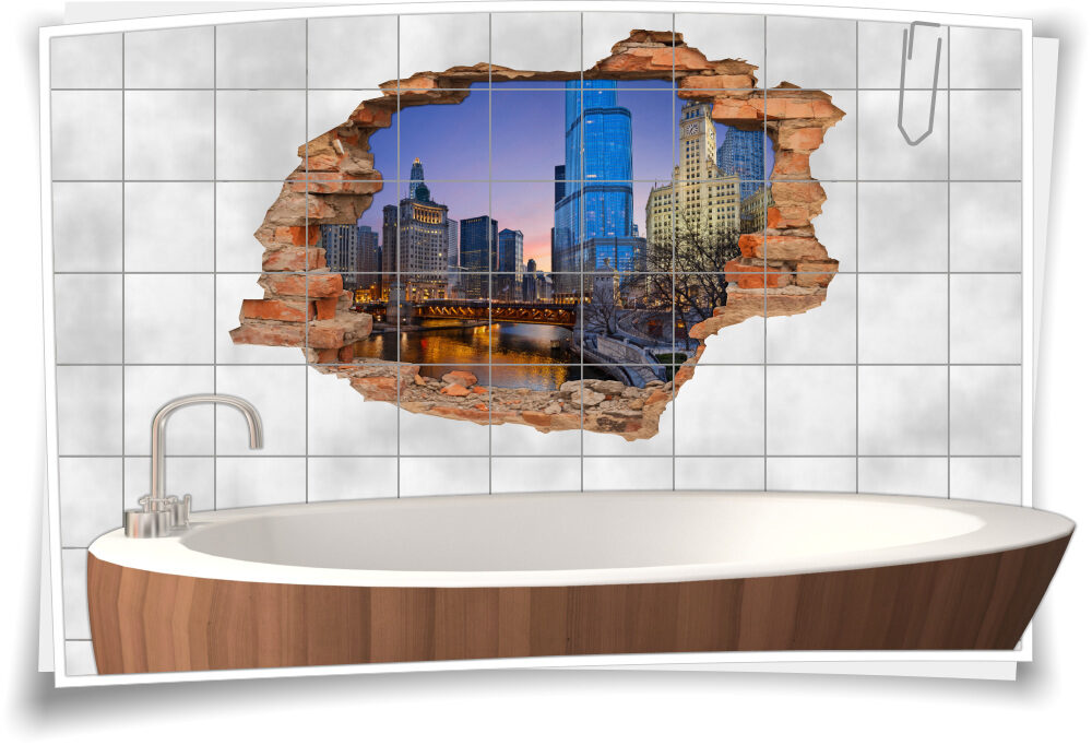3D Fliesen-Aufkleber Fliesen-Bild Fliesen-Tattoo Fliesen-Sticker Wand-Durchbruch Architektur Hoch-haus Stadt-Zentrum City Auto-Bahn Fluss Deko Raum-Gestaltung