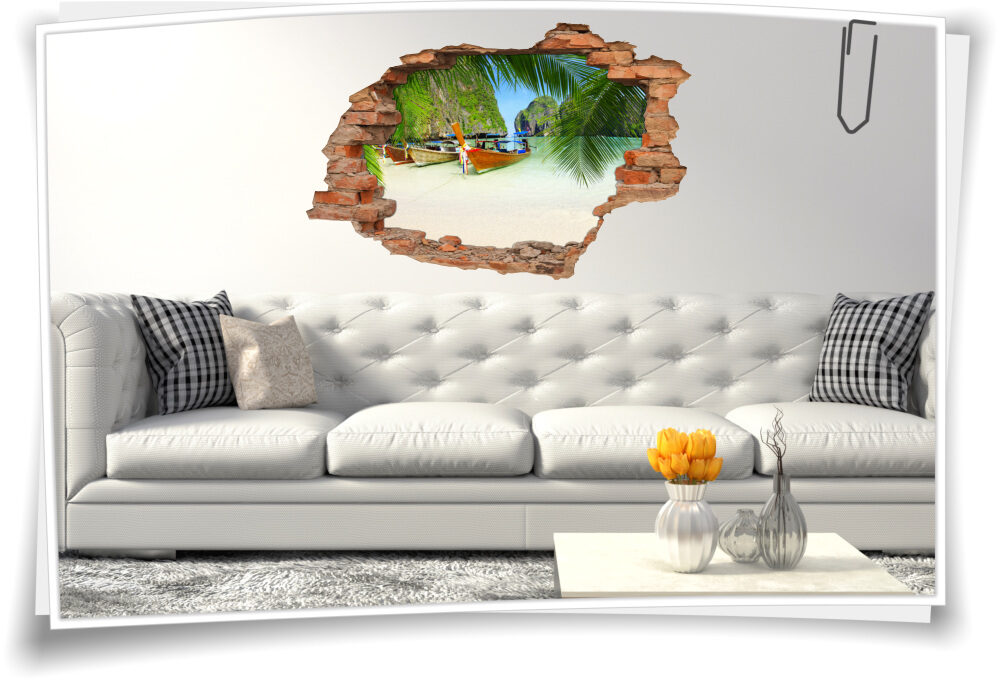 Wand-Tattoo-3D Wand-Aufkleber Wand-Bild Wand-Sticker Wand-Durchbruch Boot-s-Tour Insel-n Bucht Sand-Strand Meer Felsen