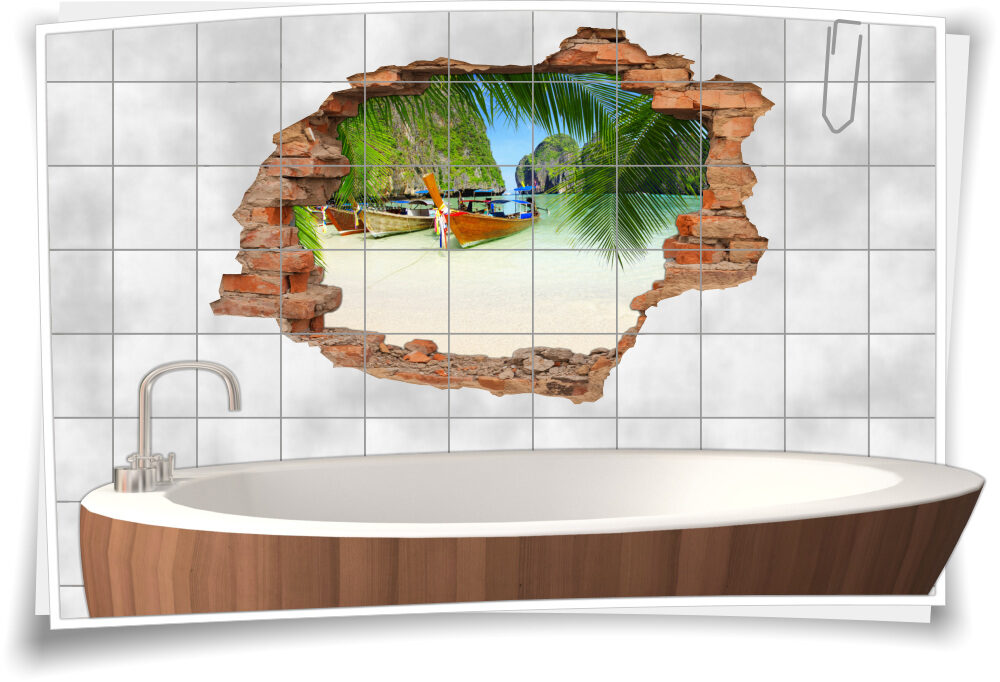 Fliesen-Aufkleber-3D Fliesen-Bild Fliesen-Tattoo Fliesen-Sticker Wand-Durchbruch Boot-s-Tour Insel-n Bucht Sand-Strand Meer Felsen