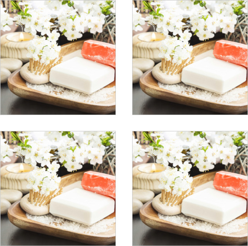 Fliesen-Aufkleber Fliesen-Bild Salz Seife Kerze Blüten SPA Wellness Pastell Beige Bad WC Deko