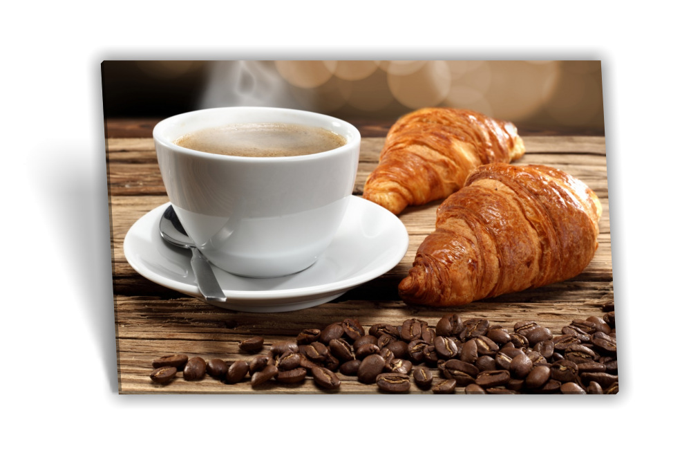 Leinwand-Bild Keilrahmen-Bild Kaffee-Bohnen Kaffee-Tasse Croissant Frühstück