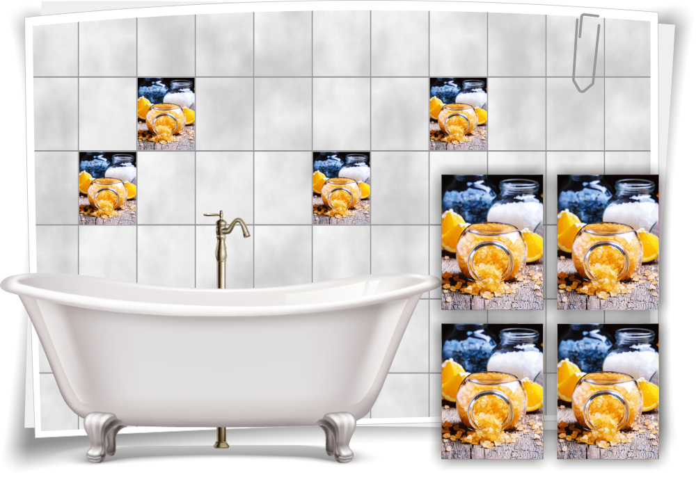 Fliesen-Aufkleber SPA Wellness Bade-Salz Holz Orange Gelb Glas Grau Bad WC Deko